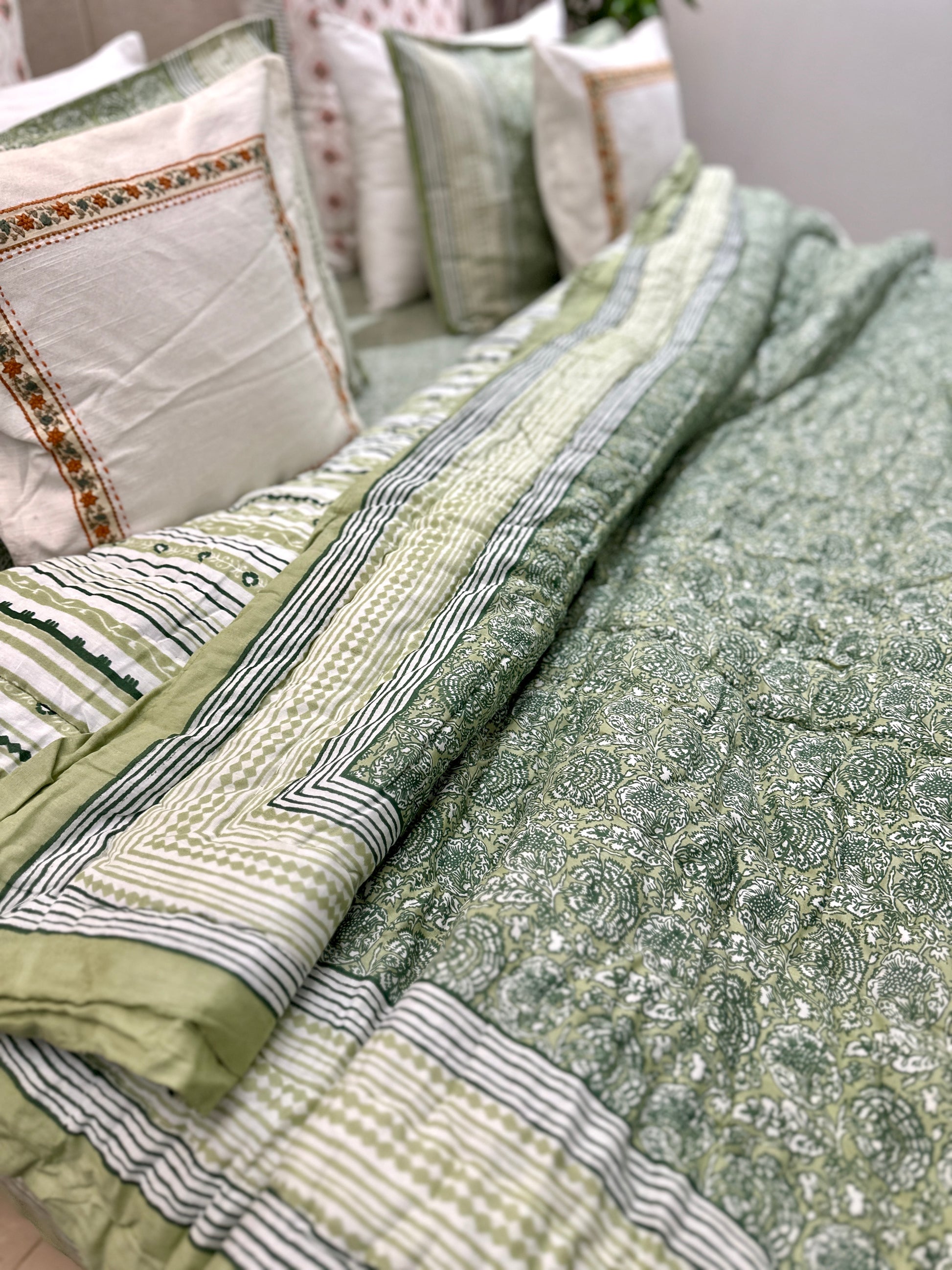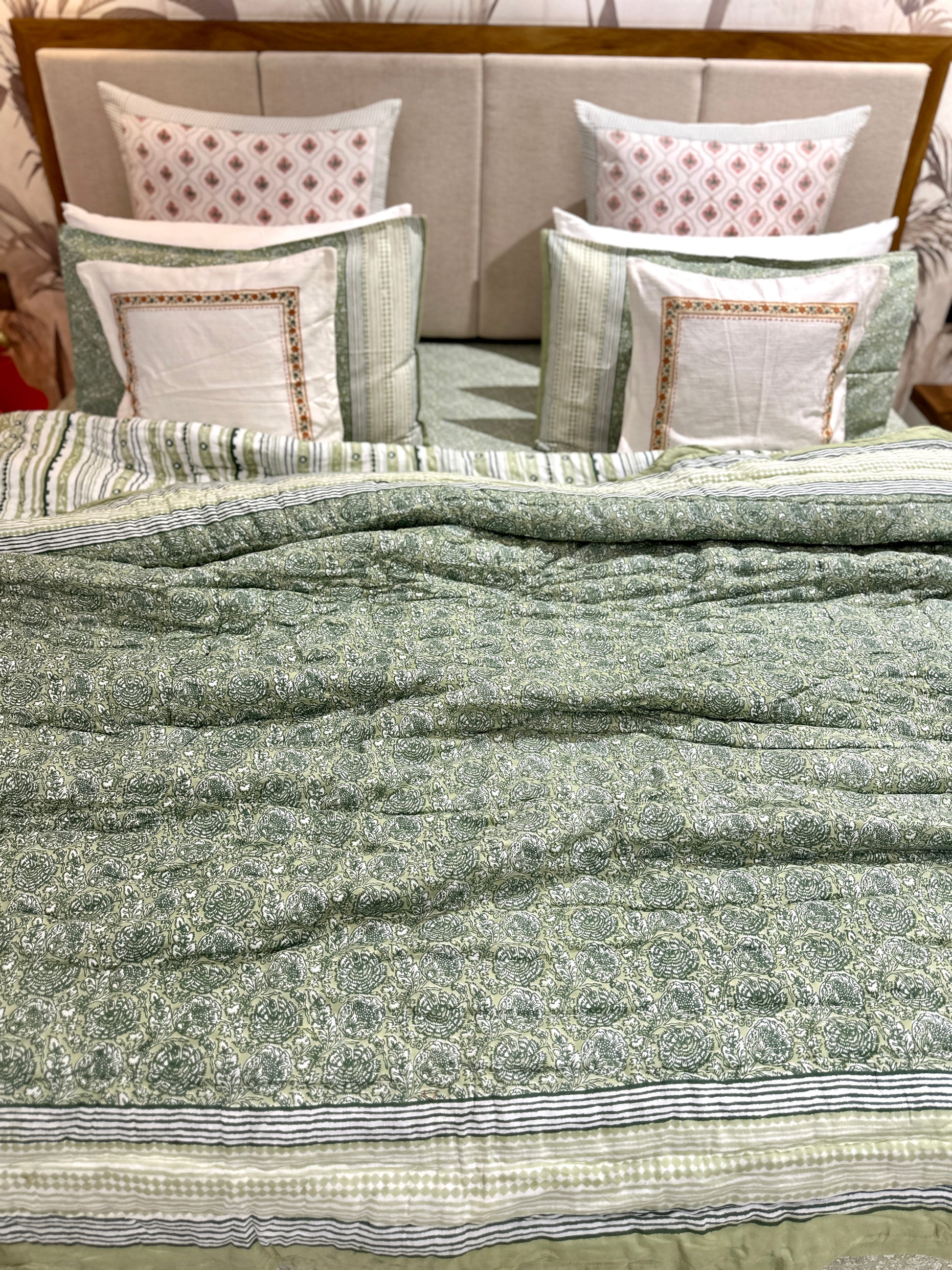 Bedding Set Hand Print | Quilt with Bedsheet Set | Mint Whisper