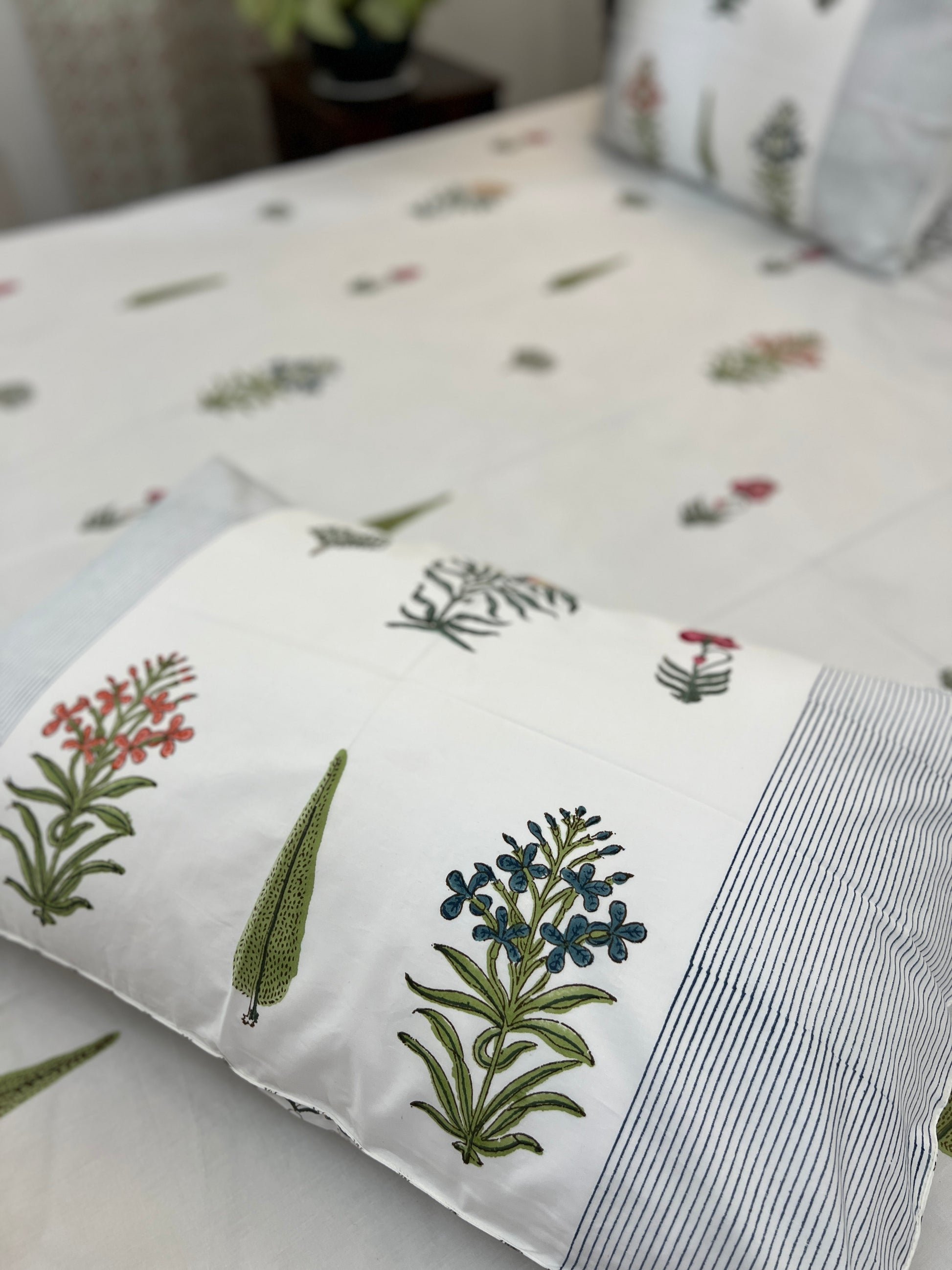 Bedsheet - Hand or Machine wash with cold water using a mild detergent. Do not soak, bleach or tumble dry. Dry in shade. It is recommended to wash whites and dark colors separately. Warm Iron as needed.