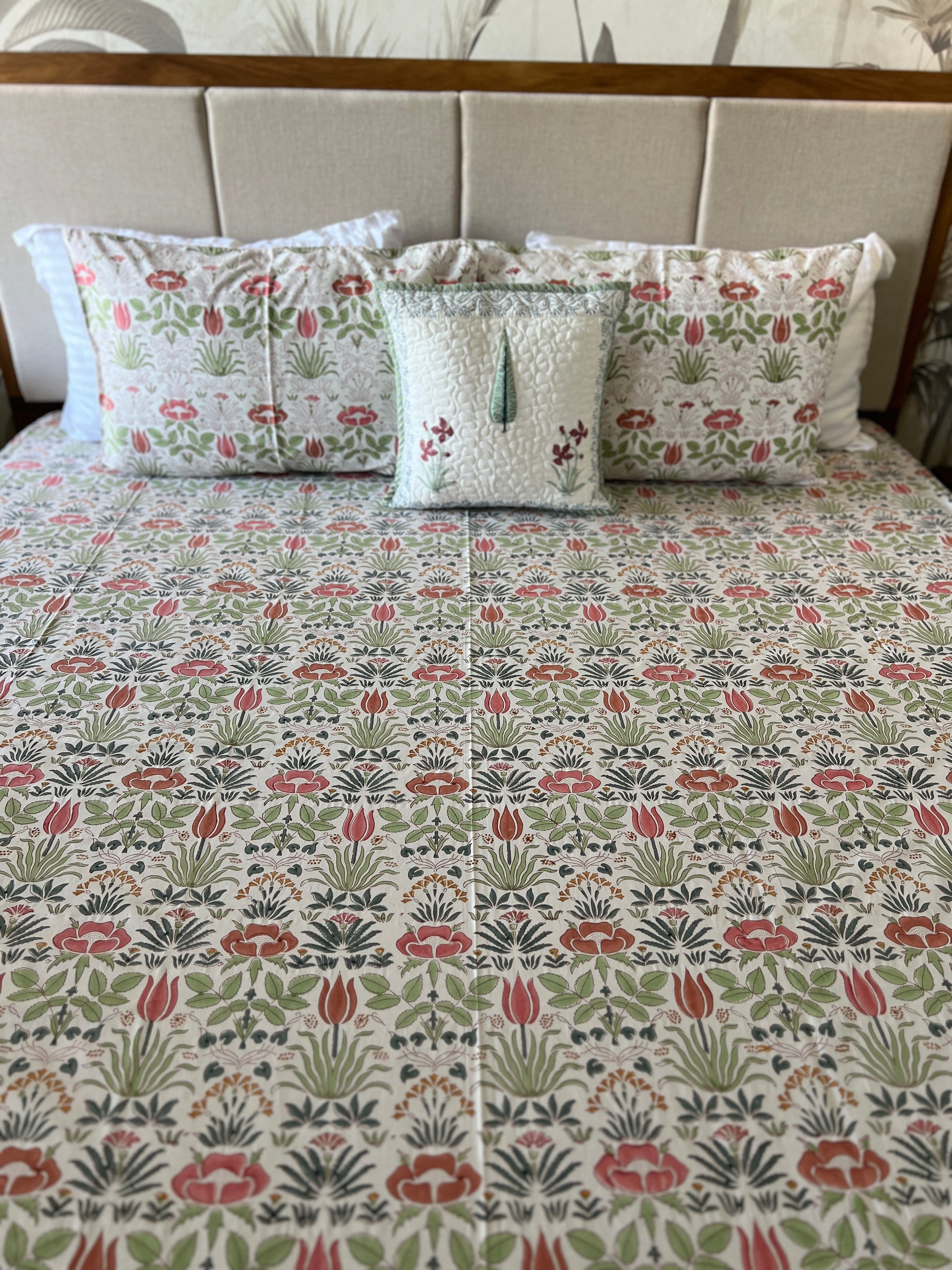 Paired seamlessly with the quilt is a matching bedsheet, designed to complement the intricate patterns and colors.