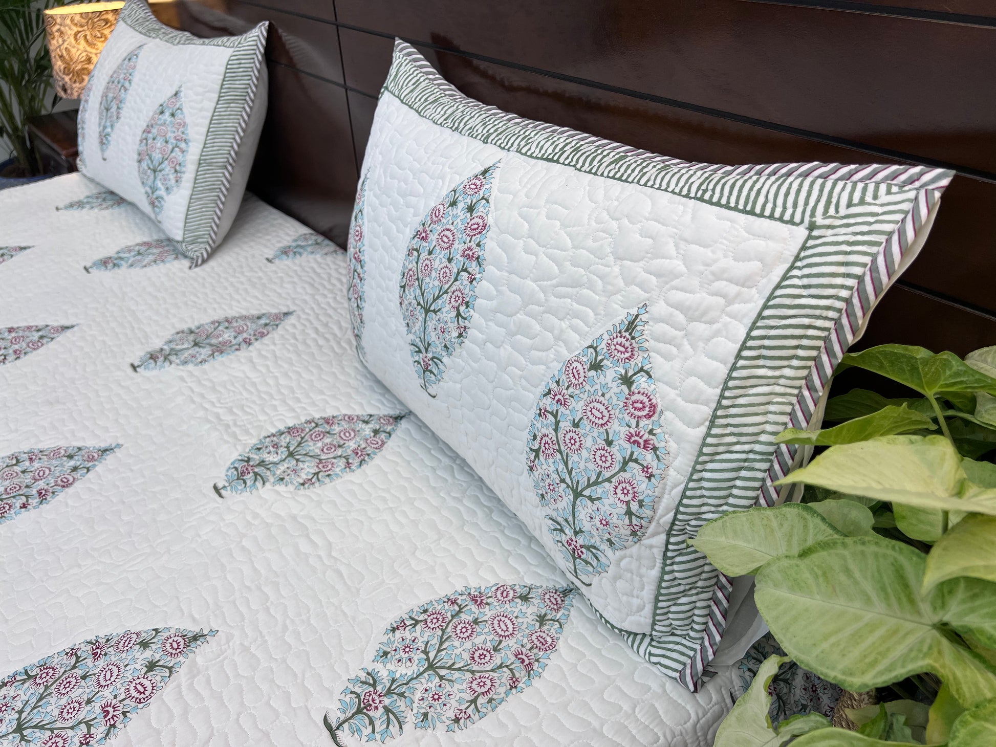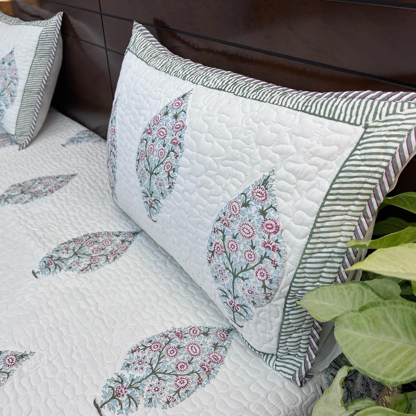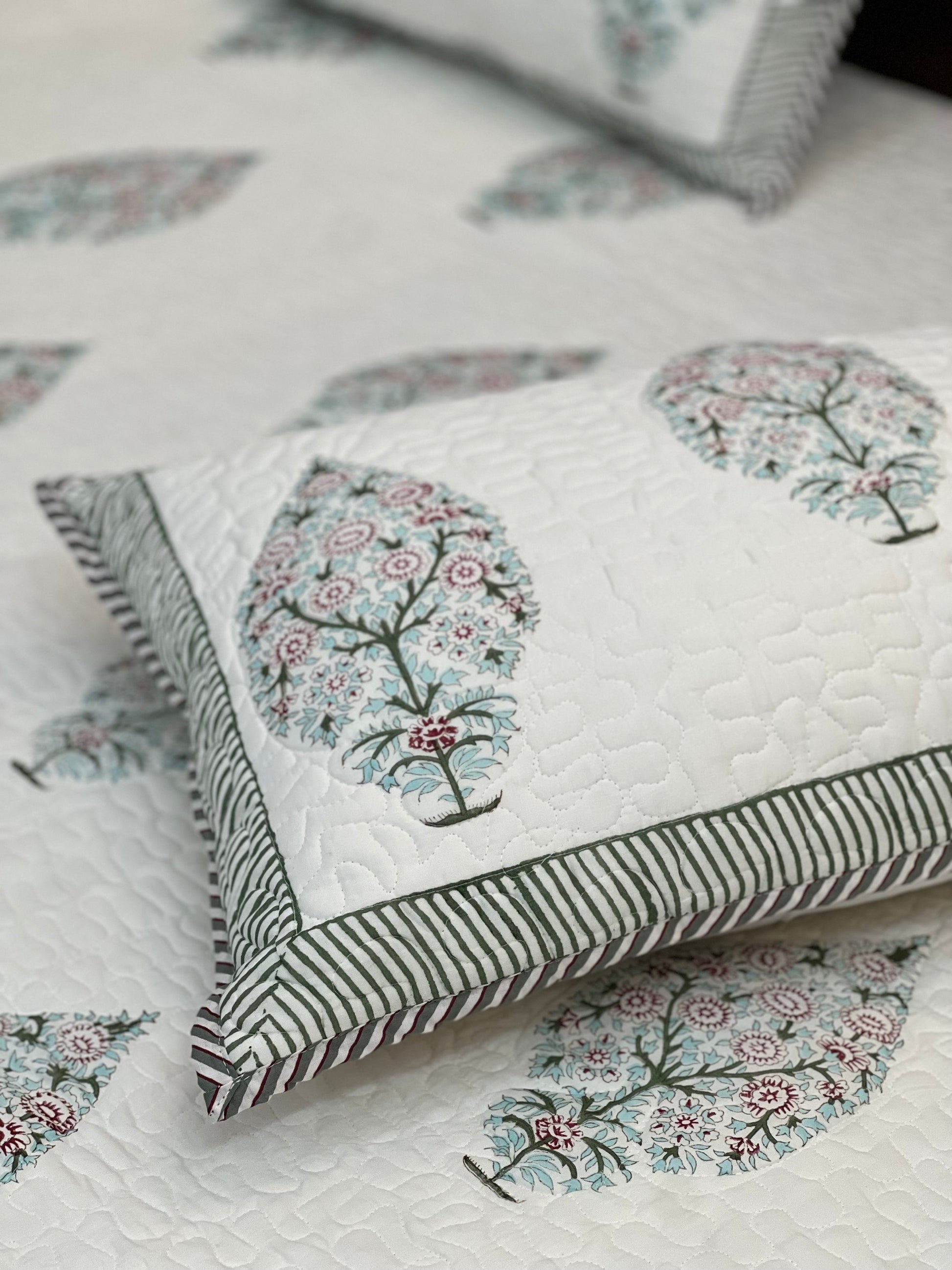 Luxury with a splash of colour!Add a touch of elegance to your furnishings with these absolute fabulous and beautiful premium handblock printed bedcovers. A beautiful vibrant set of hand-block printed bedcover and pillow cases. The design pattern is block printed by hand, on a soft cotton fabric with hand-carved wood blocks dipped in natural vegetables dyes. An additional layer of cotton fabric is quilted with the printed fabric to add to look and longevity of the product.