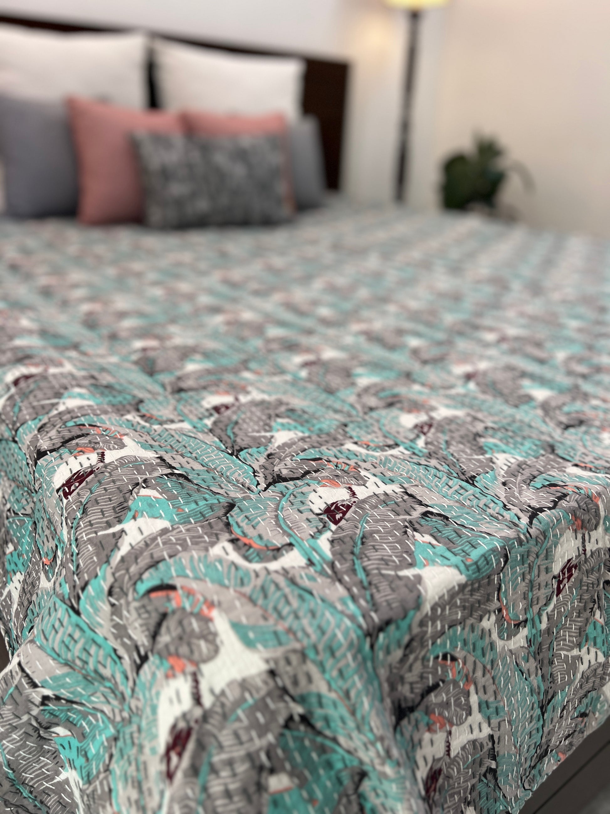 Every stitch of the "Banana Leaf" Kantha Bedcover is meticulously handcrafted, showcasing the artistry and precision of Kantha embroidery. Skilled artisans have intricately woven banana leaf patterns, creating a captivating tapestry of botanical charm.