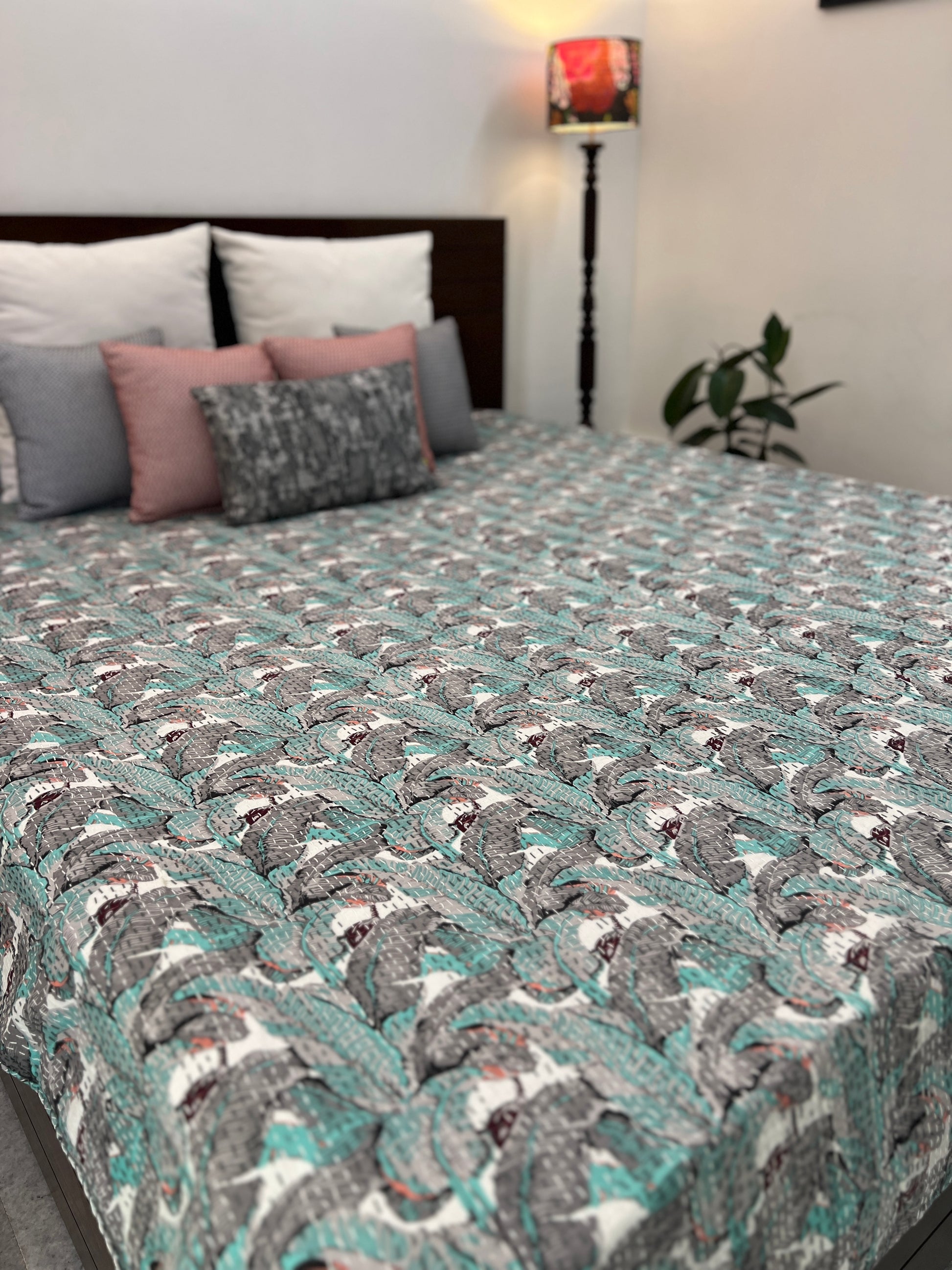 Drawing inspiration from the lush greenery of tropical landscapes, this bedcover captures the grace and beauty of banana leaves. It brings the vibrant energy of nature into your space, creating a refreshing and invigorating ambiance.