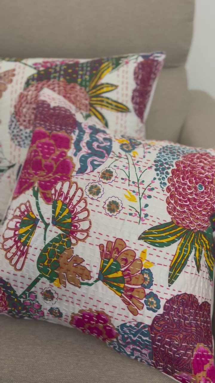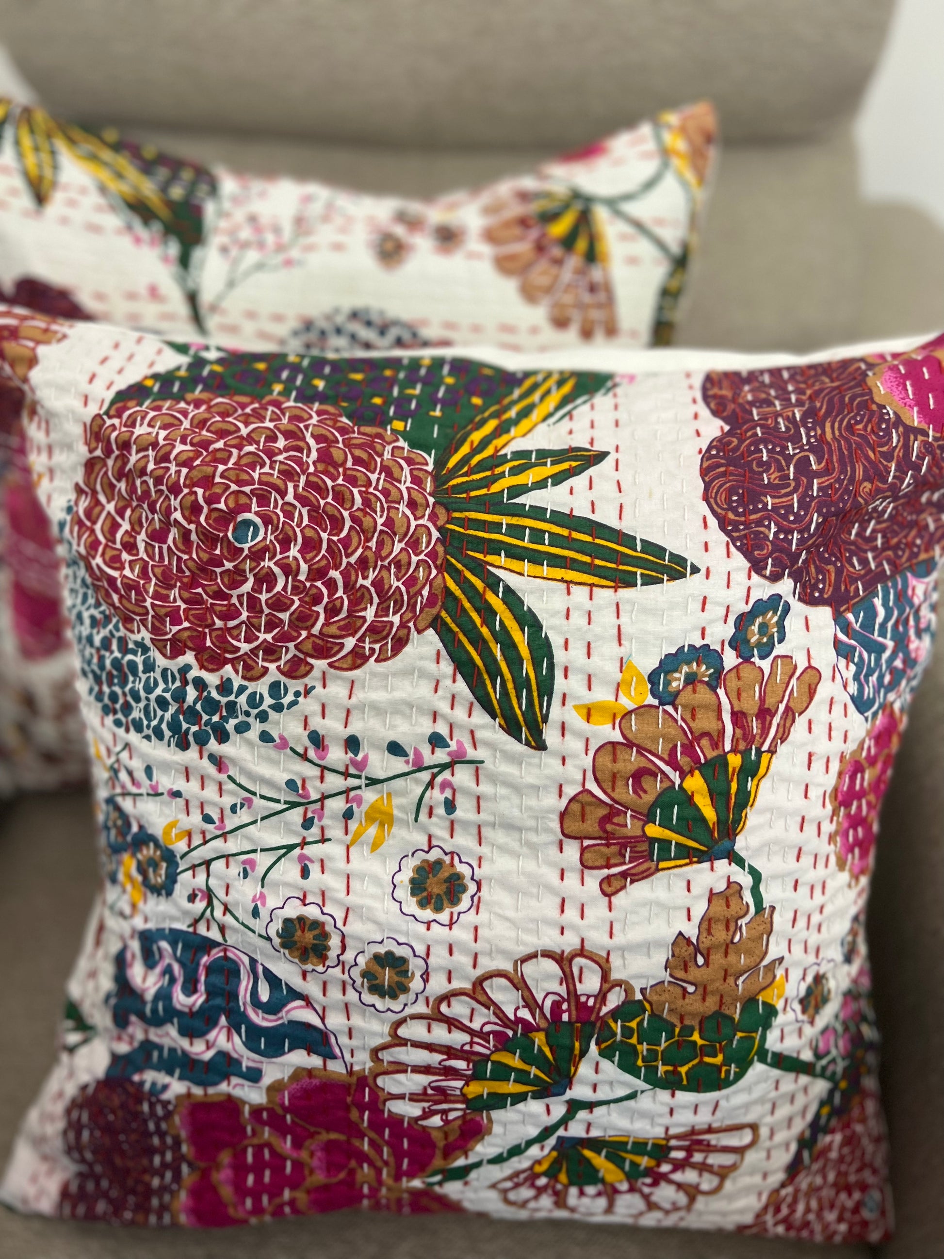 Kantha Cushion Cover | 16*16 Inches | White-Pink Flowers