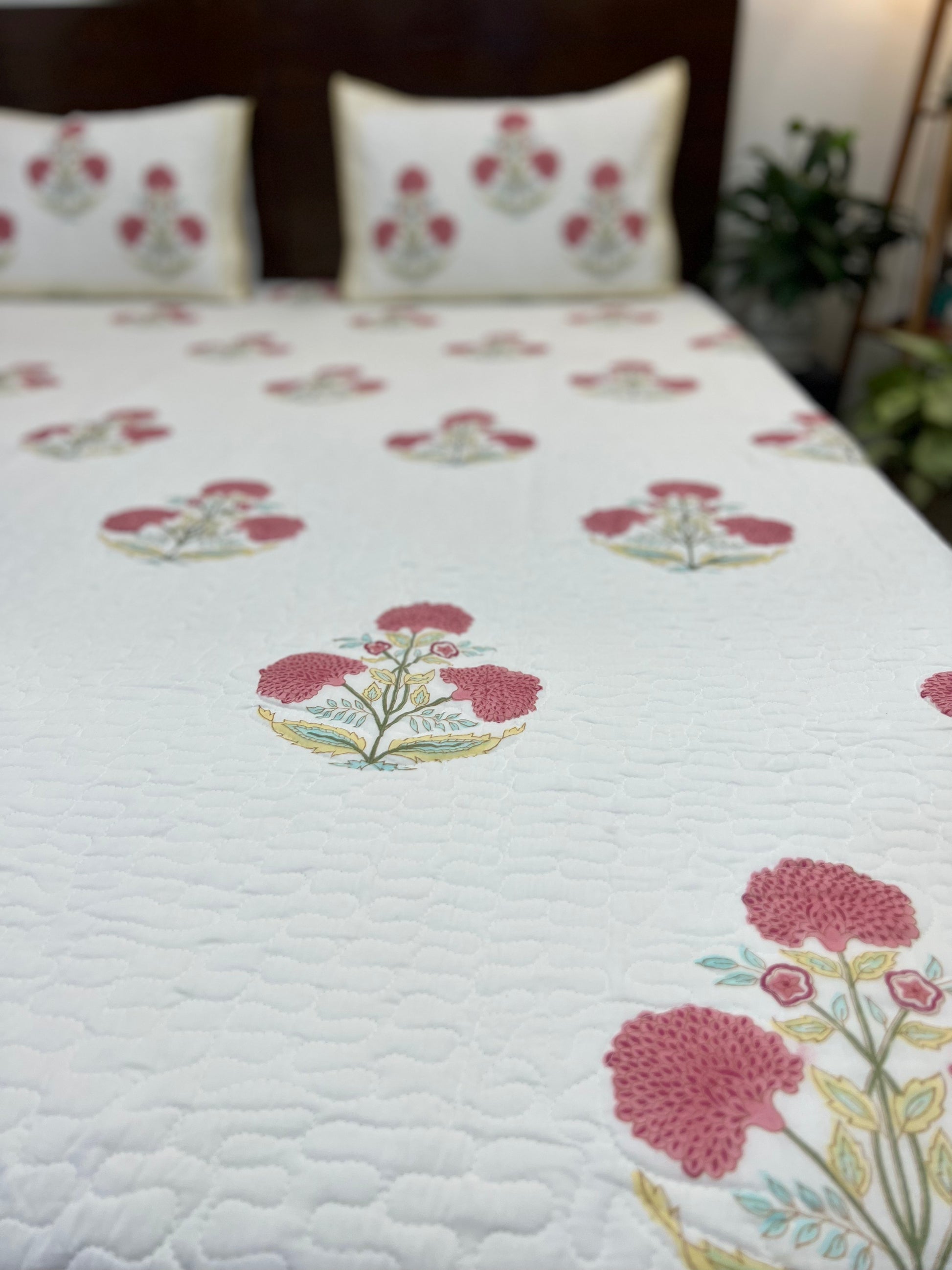 Luxury with a splash of colour!Add a touch of elegance to your furnishings with these absolute fabulous and beautiful premium handblock printed bedcovers. A beautiful vibrant set of hand-block printed bedcover and pillow cases. The design pattern is block printed by hand, on a soft cotton fabric with hand-carved wood blocks dipped in natural vegetables dyes. An additional layer of cotton fabric is quilted with the printed fabric to add to look and longevity of the product.