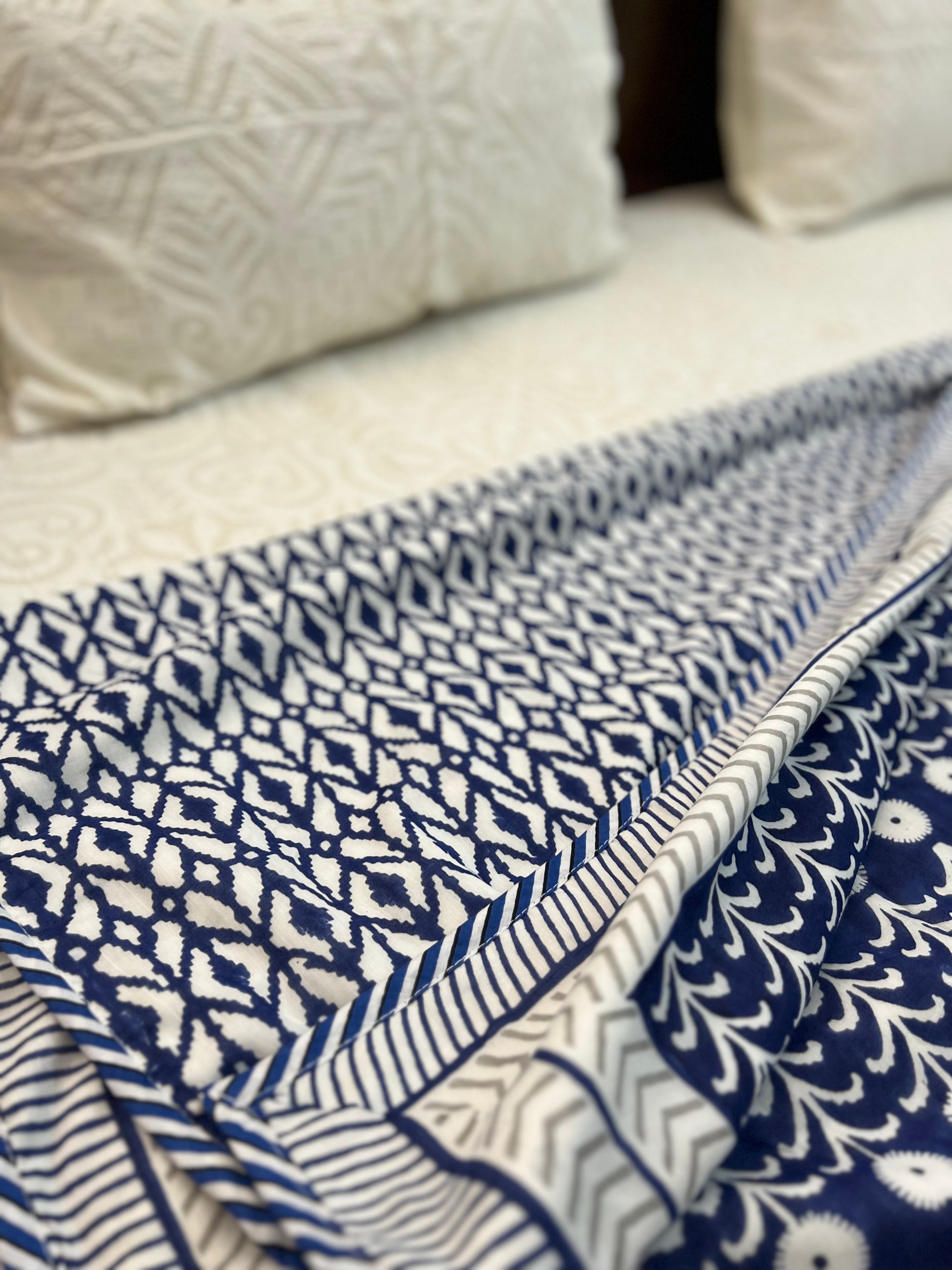 This cozy dohar is perfect for moderate climate. Both layers of the dohar is made using traditional craft of hand block printing ie. the design pattern is stamped by hand, on a soft cotton fabric with hand-carved wood blocks dipped in natural dyes. The reverse side of this dohar has an intricate jaal print. Fused cotton filling has been used inside the two layers of this dohar to add extra warmth.