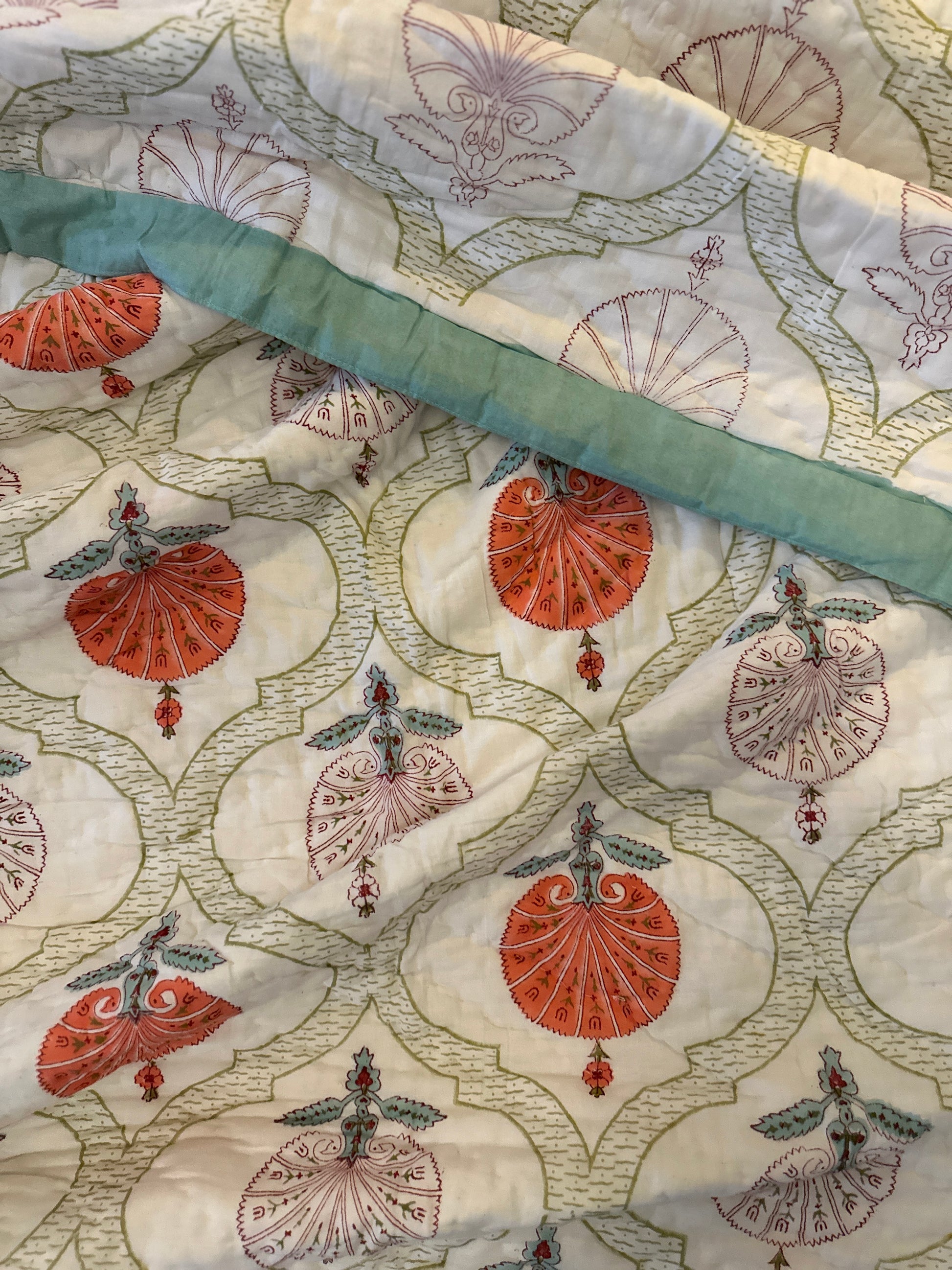 The quilt showcases an elegant "Love Birds" motif, symbolizing harmony and affection. On one side, a detailed and colorful bird pattern is displayed, while the reverse features a complementary, subtler print—ideal for a reversible look.