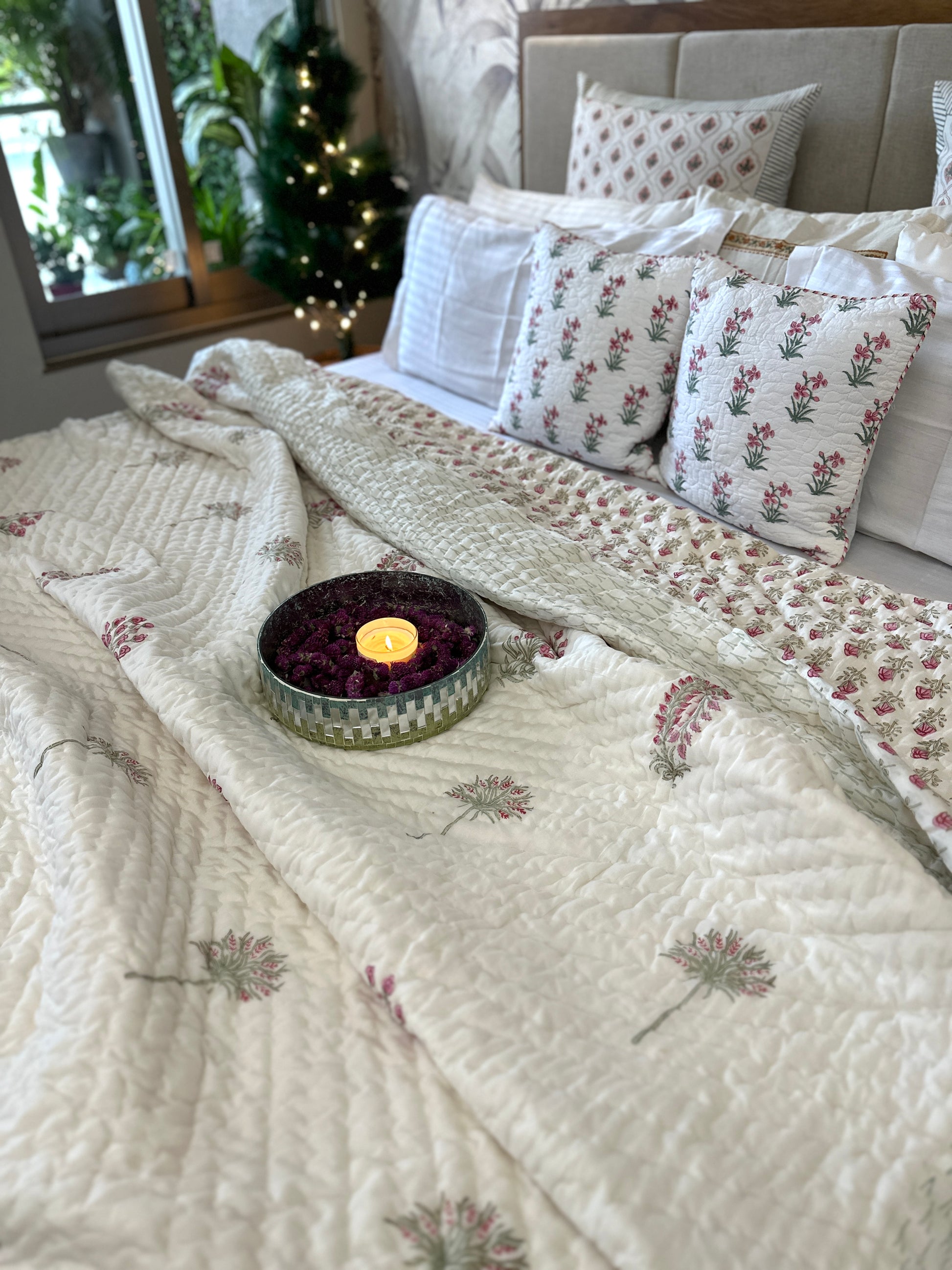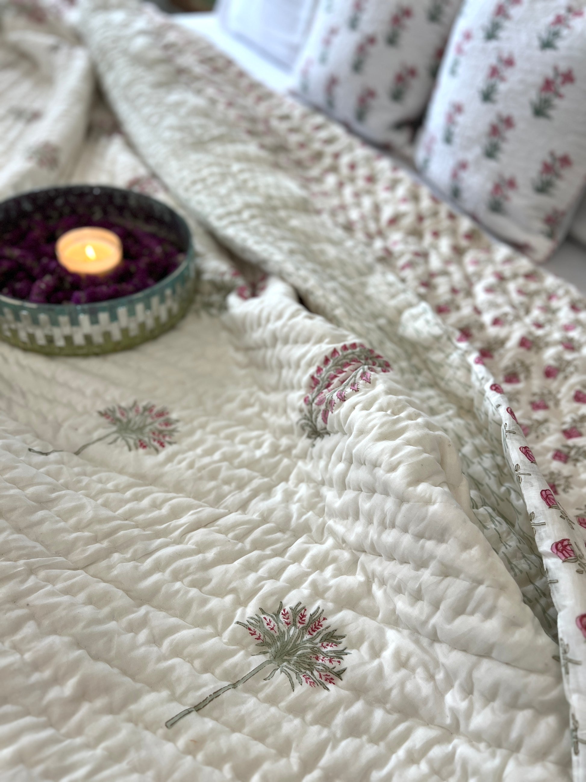 Elevate your space with the enchanting charm of our Reversible Hand Block Quilt – Moonlit Motifs. Adorned with intricate, hand-blocked patterns reminiscent of moonlit nights, this reversible design offers beauty and versatility for a cozy, elegant touch.