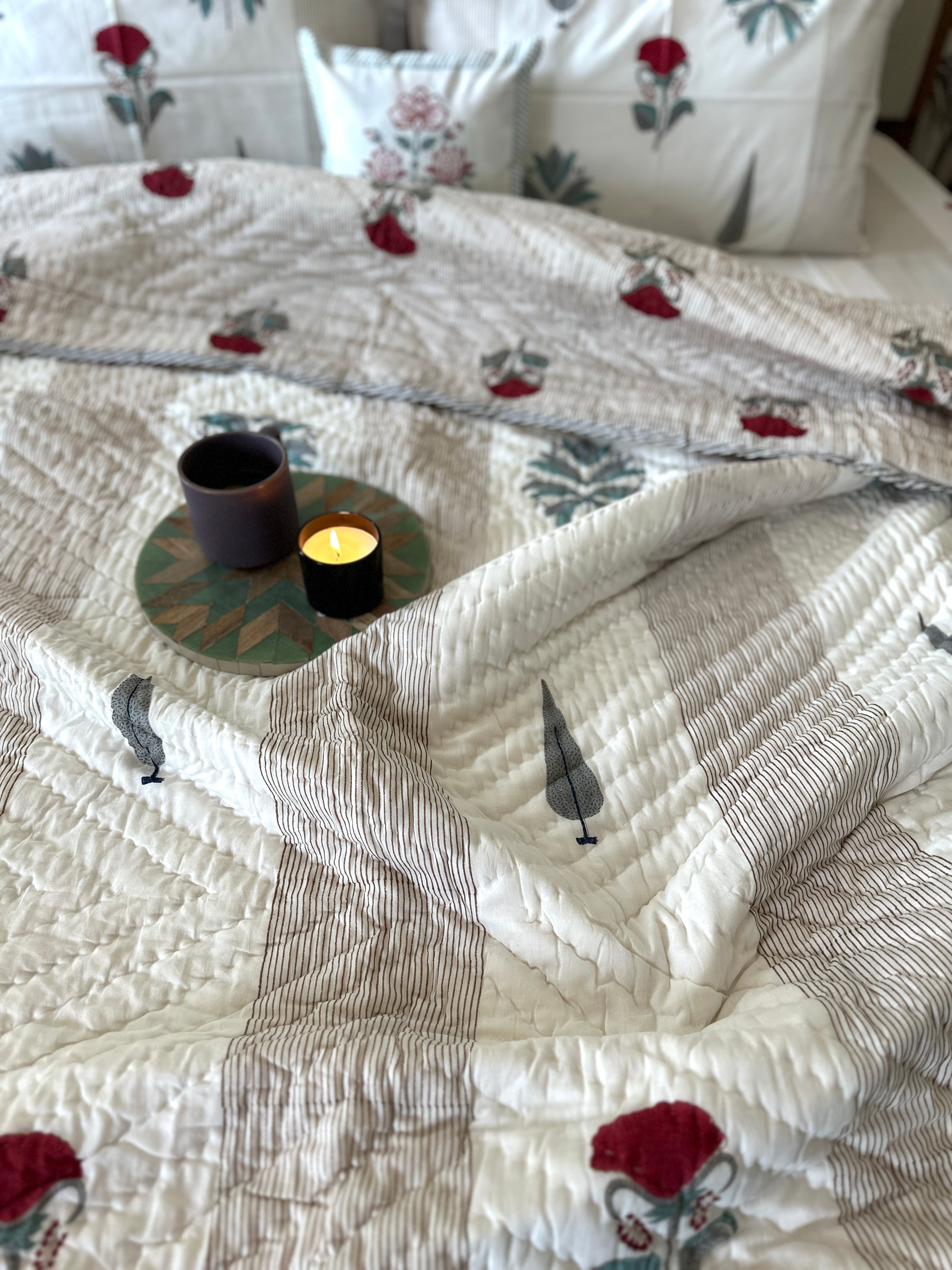 Indulge in the luxury of timeless craftsmanship and unparalleled comfort with our Reversible Hand Block Quilt. Meticulously designed and skillfully handcrafted, this quilt is a true masterpiece that brings an air of elegance to your bedroom.