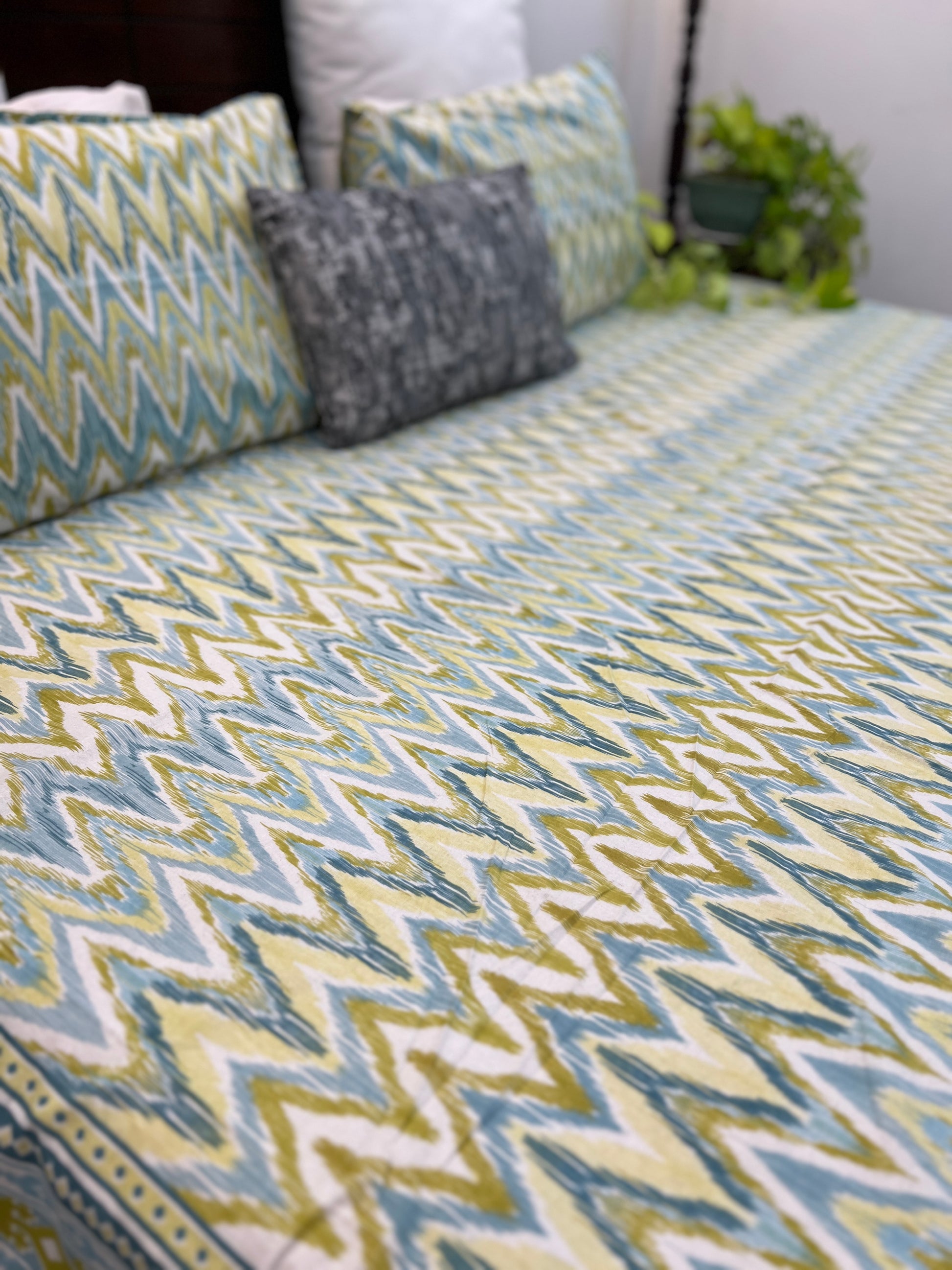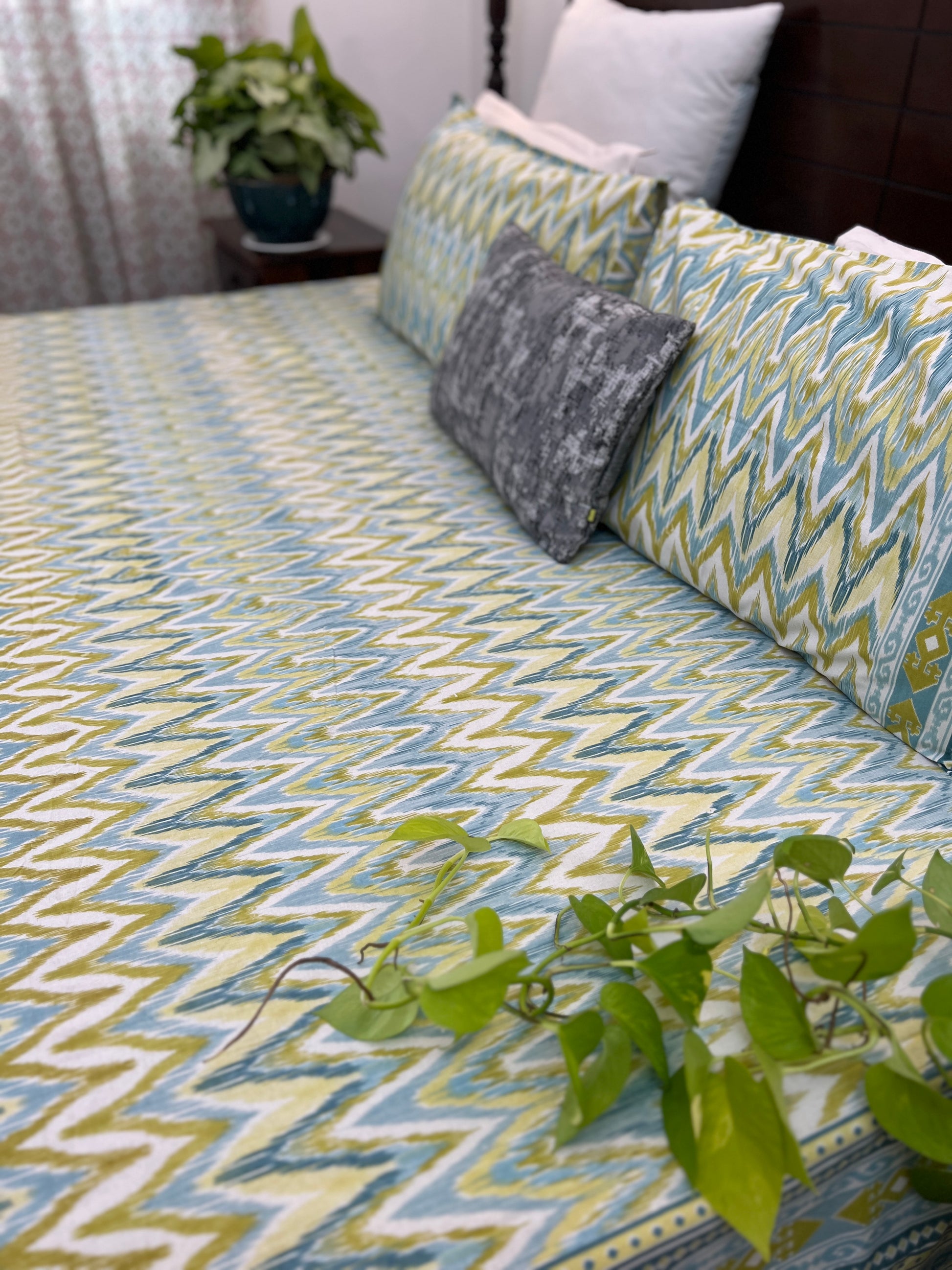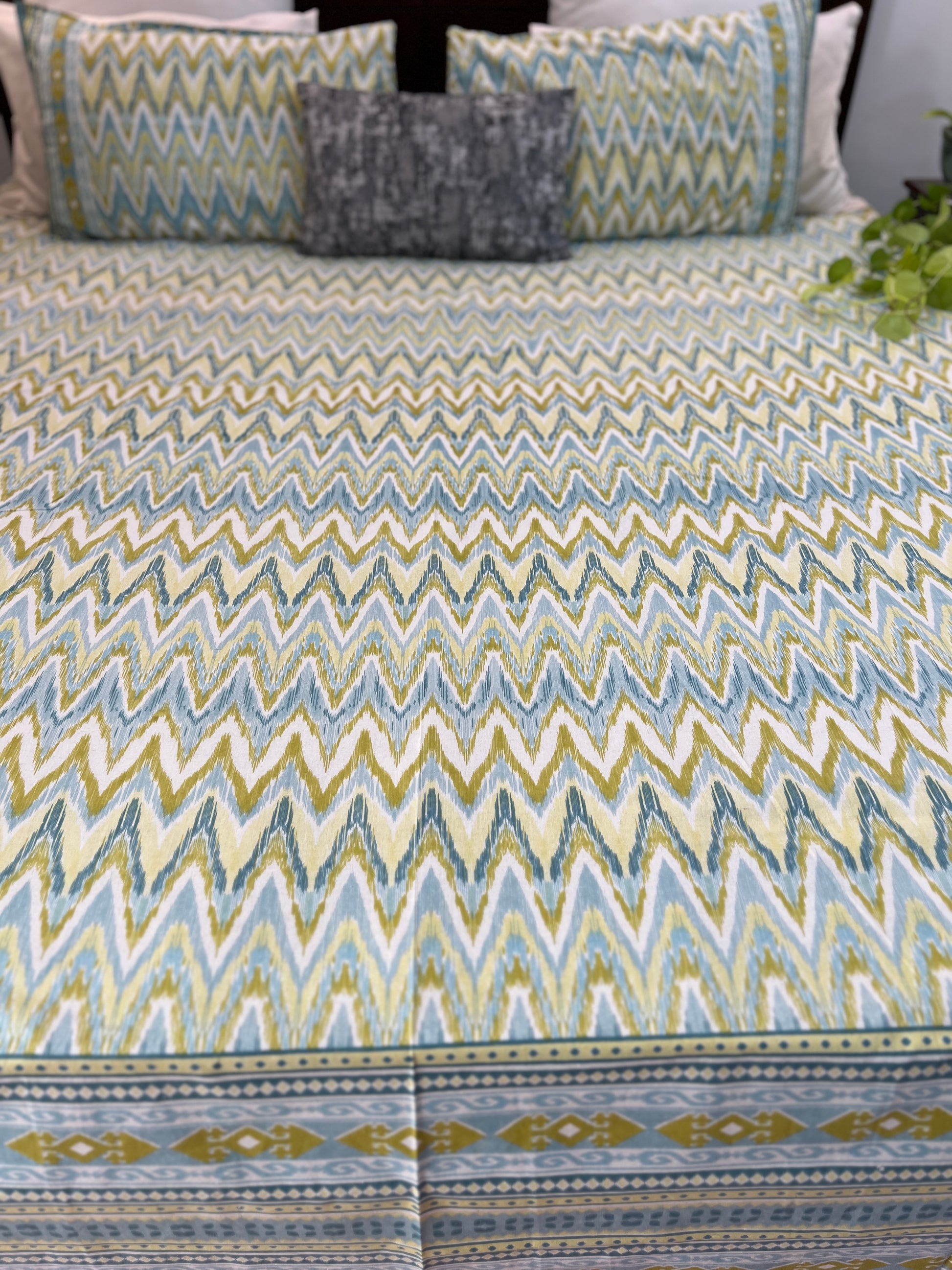 Introducing our Ikkat Fusion Super King Size Bedsheet, a harmonious blend of traditional Ikkat patterns and contemporary design. This luxurious bedsheet measures an expansive 108*108 inches, providing ample coverage and comfort for your super king size bed.